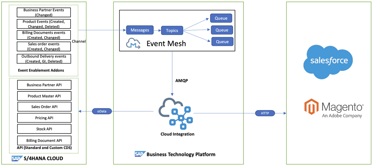 Enable the lead to cash process by real-time integration of a leading CRM system (Salesforce), and a leading e-commerce platform (Magento) with S/4 HANA Public Cloud.